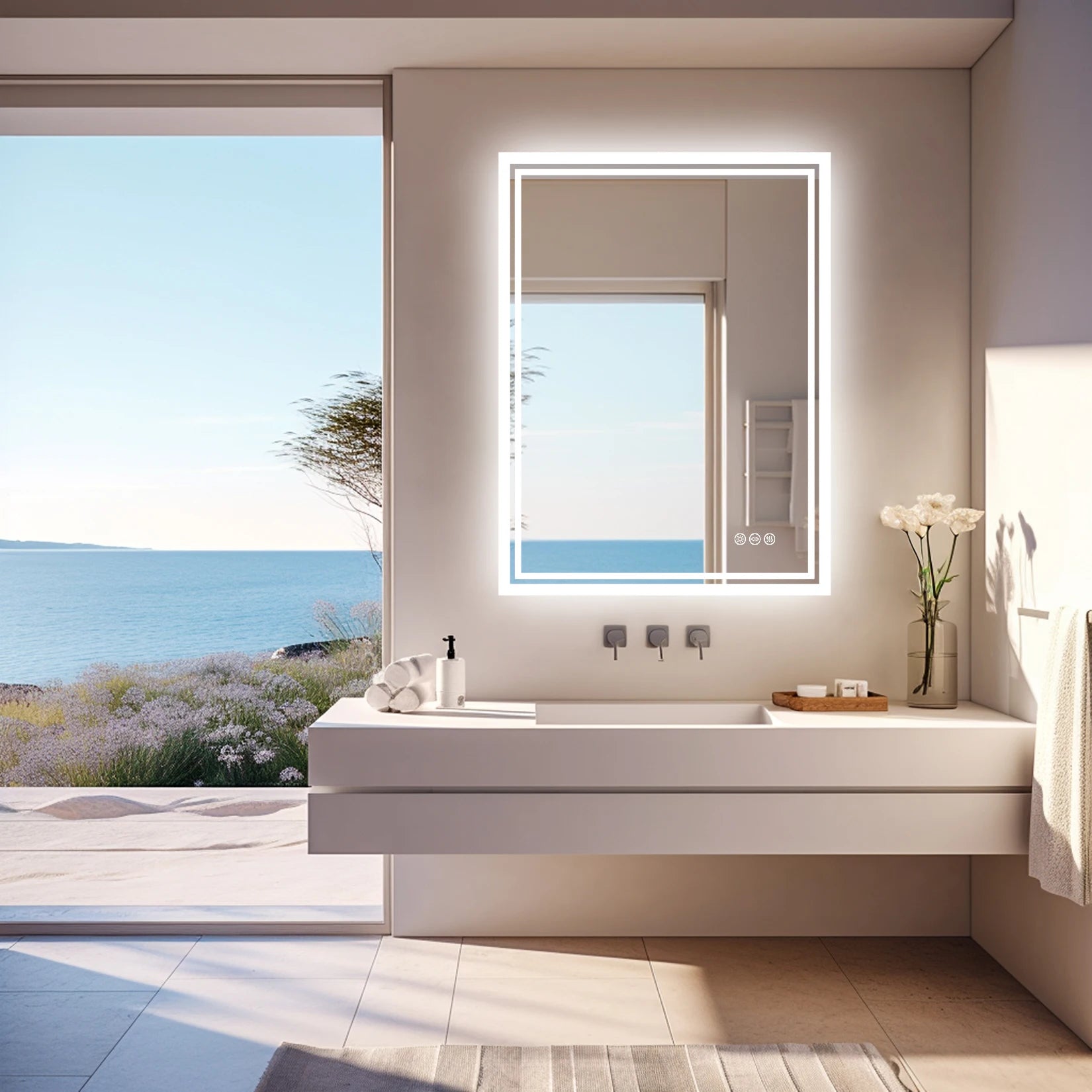 Rectangle Wall Hanging Led Backlit Light Up Bathroom Mirror for Makeup Shaving with Touch Switches 3 Lights Defog